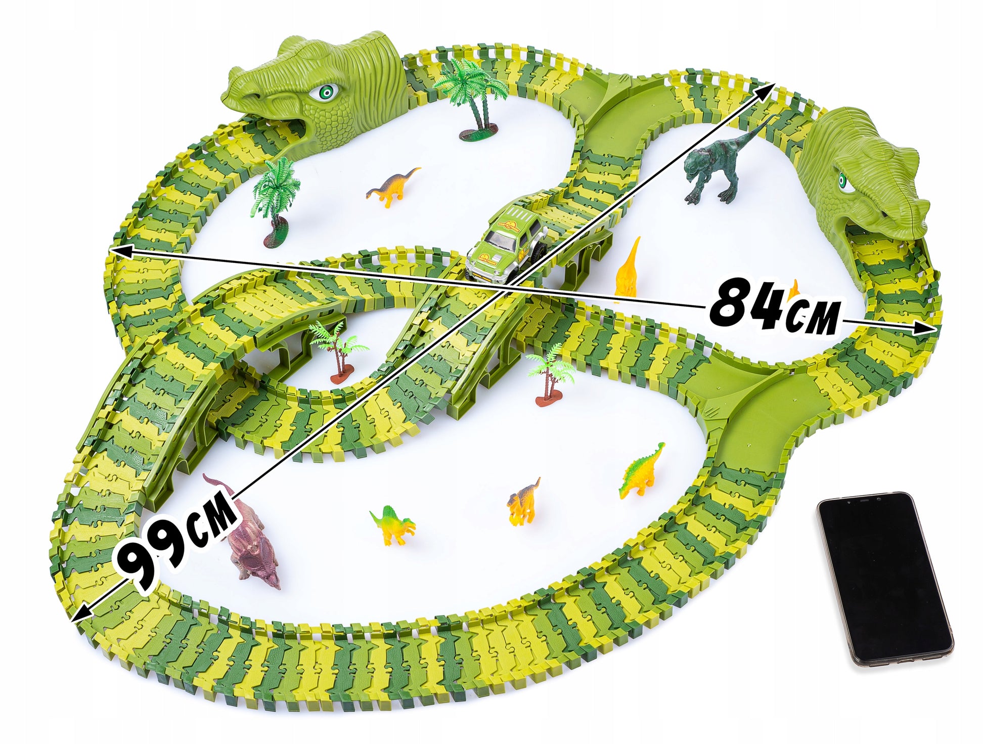 Tak, tor wykonany jest z bezpiecznego tworzywa. Figurki dinozaurów i drzewka są lekkie, aby nie zrobiły krzywdy przy ewentualnym upadku, co czyni je bezpiecznymi nawet dla energicznych 3-latków.